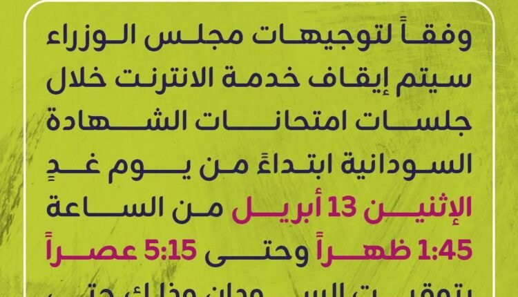 أعلنت شركة زين للاتصالات عن تنويه لمشتركيها، أفادت فيه بأنه وبناءً على توجيهات مجلس الوزراء، سيتم إيقاف خدمة الإنترنت خلال جلسات امتحانات الشهادة السودانية، وذلك ابتداءً من يوم غدٍ الإثنين 13 أبريل، من الساعة 1:45 ظهراً وحتى 5:15 عصراً بتوقيت السودان، ويستمر الإيقاف خلال فترة الامتحانات المقررة.