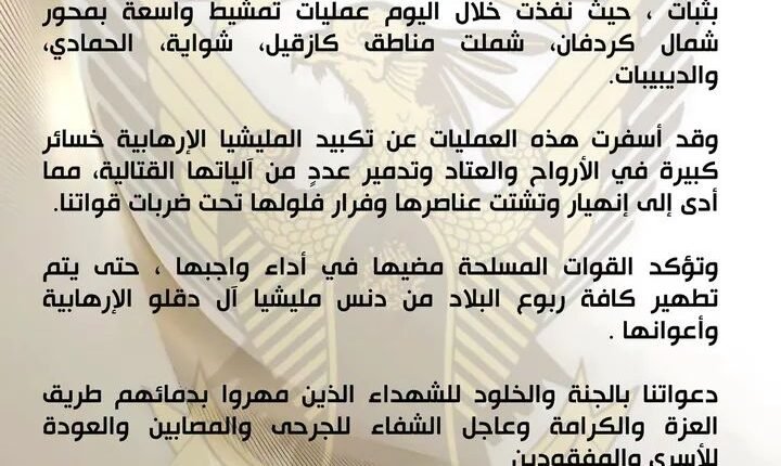 أعلنت القيادة العامة للقوات المسلحة ، تنفيذ عمليات تمشيط واسعة بمحور شمال كردفان، شملت مناطق كازقيل، شواية، الحمادي، والديبيبات.