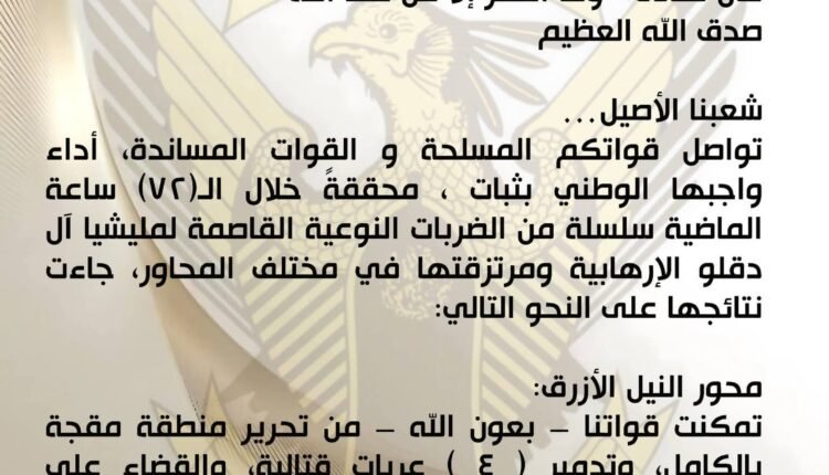 تواصل قواتكم المسلحة و القوات المساندة، أداء واجبها الوطني بثبات ، محققةً خلال الـ(٧٢) ساعة الماضية سلسلة من الضربات النوعية القاصمة لمليشيا آل دقلو الإرهابية ومرتزقتها في مختلف المحاور، جاءت نتائجها على النحو التالي: