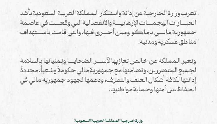 أعربت وزارة الخارجية السعودية عن إدانة واستنكار المملكة العربية السعودية بأشد العبارات للهجمات الإرهابية والانفصالية التي وقعت في العاصمة المالية باماكو وعدد من المدن الأخرى، والتي استهدفت مواقع عسكرية ومدنية.