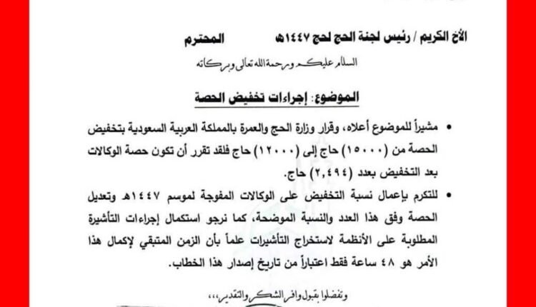 وقال عمر مصطفى علي الأمين العام المكلف للهيئة العامة للحج والعمرة في خطاب إلى الوكالات إنه نسبة للتخفيض، فإنه على الوكالات المفوجة لموسم 1447م وتعديل الحصة وفق هذا العدد والنسبة الموضحة.