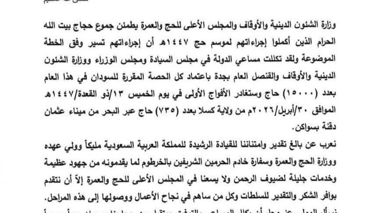 وزارة الشؤون الدينية والأوقاف والمجلس الأعلى للحج والعمرة يطمئن جموع حجاج بيت الله الحرام الذين اكملوا اجراءاتهم لموسم حج ١٤٤٧ هجرية ..أن اجراءاتهم تسير وفق الخطة الموضوعة .. ولقد تكللت مساعي الدولة في مجلس السيادة ومجلس الوزراء ووزارة الشؤون الدينية والأوقاف والقنصل العام بجدة باعتماد كل الحصة المقررة للسودان في هذا العام بعدد (١٥.٠٠٠) حاج .. وستغادر الأفواج الأولى في يوم الخميس ١٣/ ذو القعدة/١٤٤٧هجرية الموافق ٣٠ / ابريل/٢٠٢٦م من ولاية كسلا بعدد (٧٣٥) حاج عبر البحر من ميناء الأمير عثمان دقنة بسواكن.
